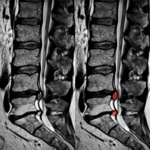 - Spondylolisthesis – This occurs when one vertebra slips out of alignment with the one above or below it, narrowing the space where the nerve exits the spine.